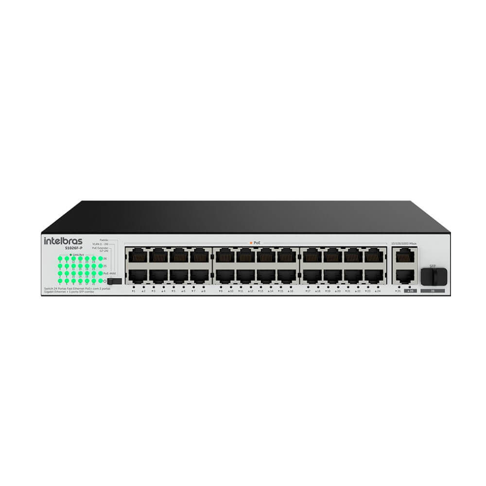 Flexibilidade e desempenho: Com duas portas Gigabit e uma SFP combo, o S1026F-P oferece maior capacidade de transmissão na rede (uplink) e facilita o cascateamento entre switches, garantindo uma infraestrutura de rede robusta e de alta performance.